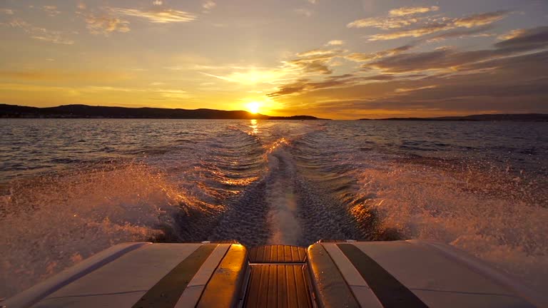 Boat driving away from sunset. Shot in super slow motion.